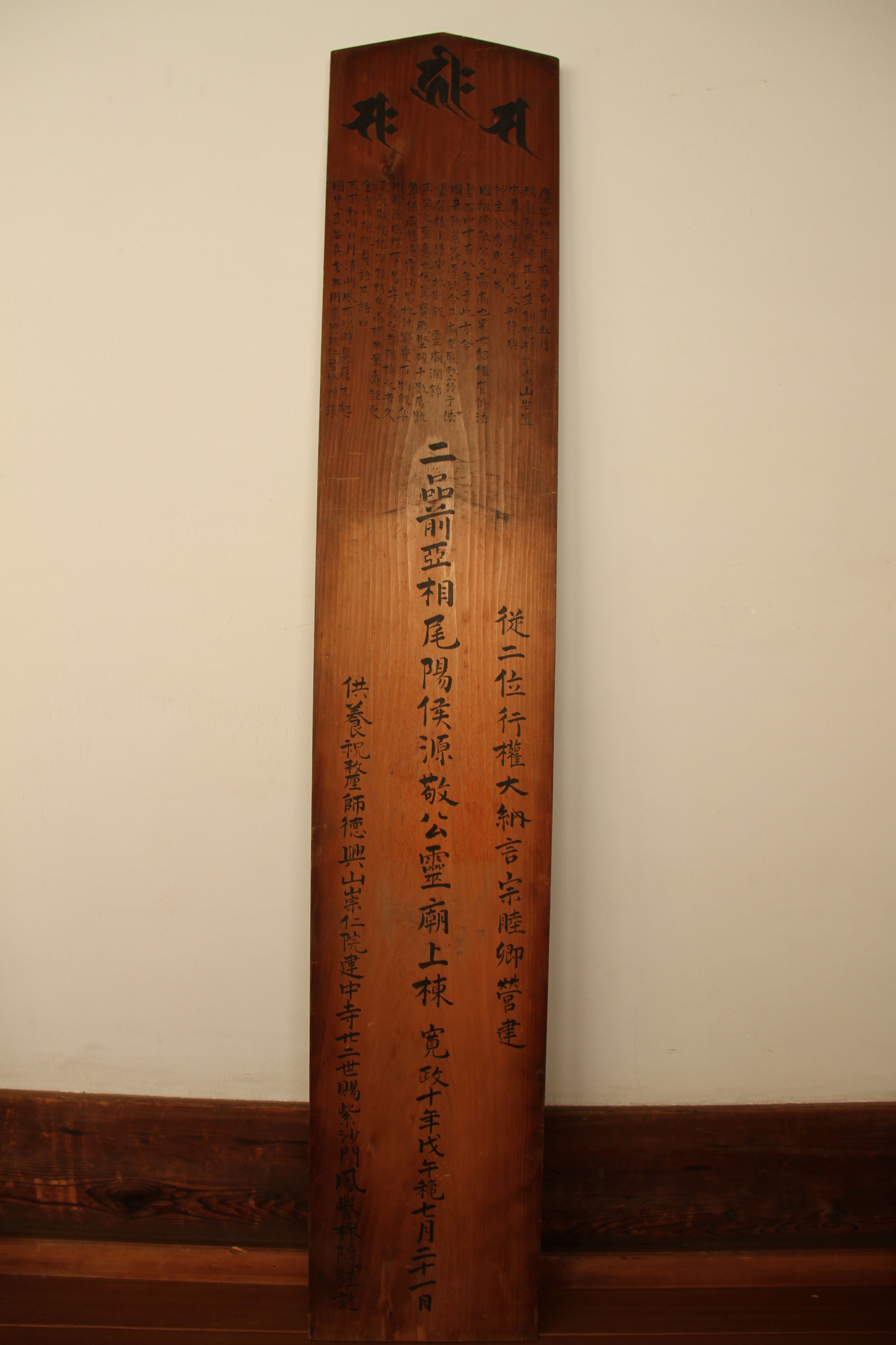 棟札に「ニ品前亜相尾陽候源敬公霊廟上棟」天明六丙午穐八月十九日