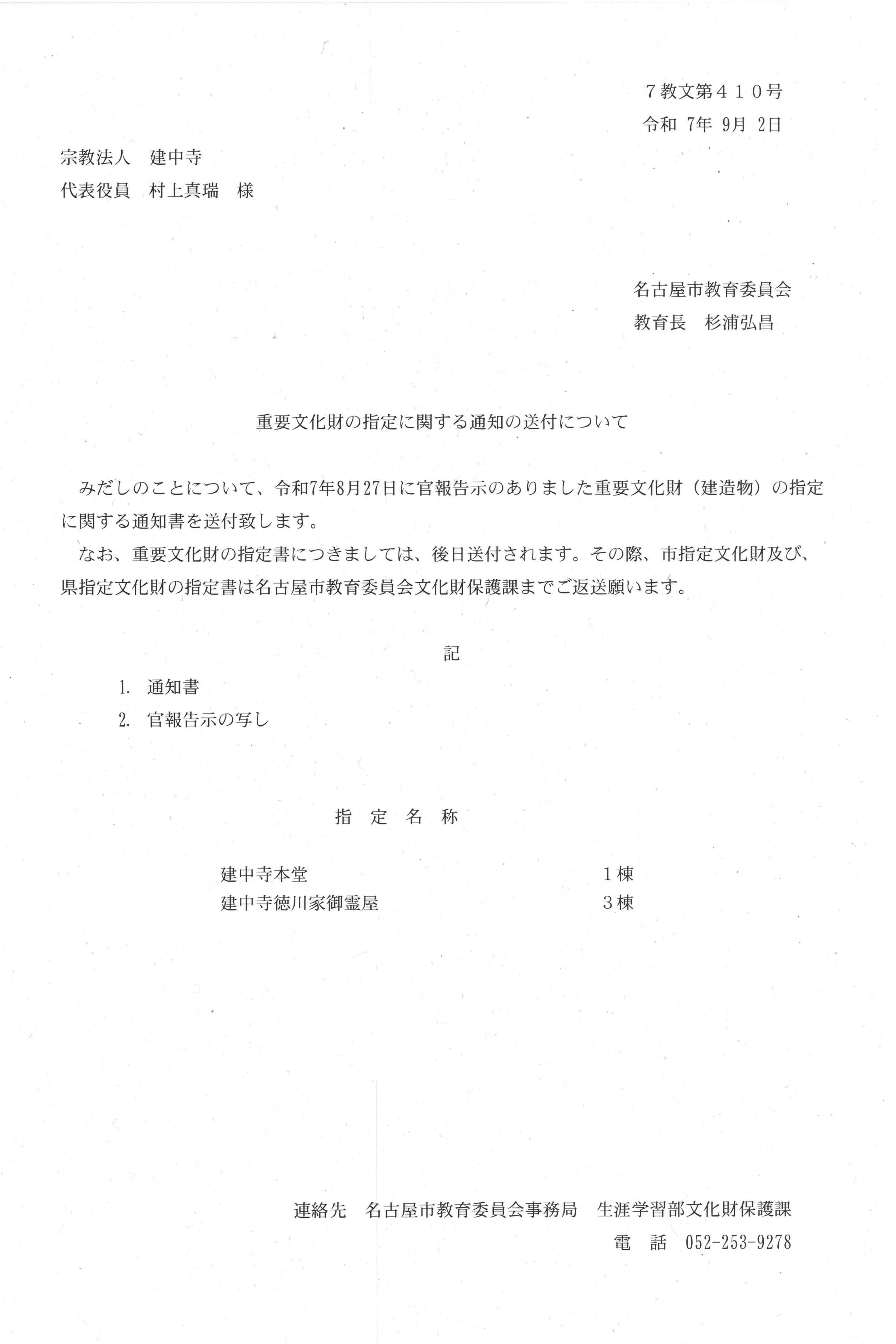 - 令和7年5月16日17時記者発表 建中寺の本堂・徳川家御霊屋が 国の重要文化財に指定されました