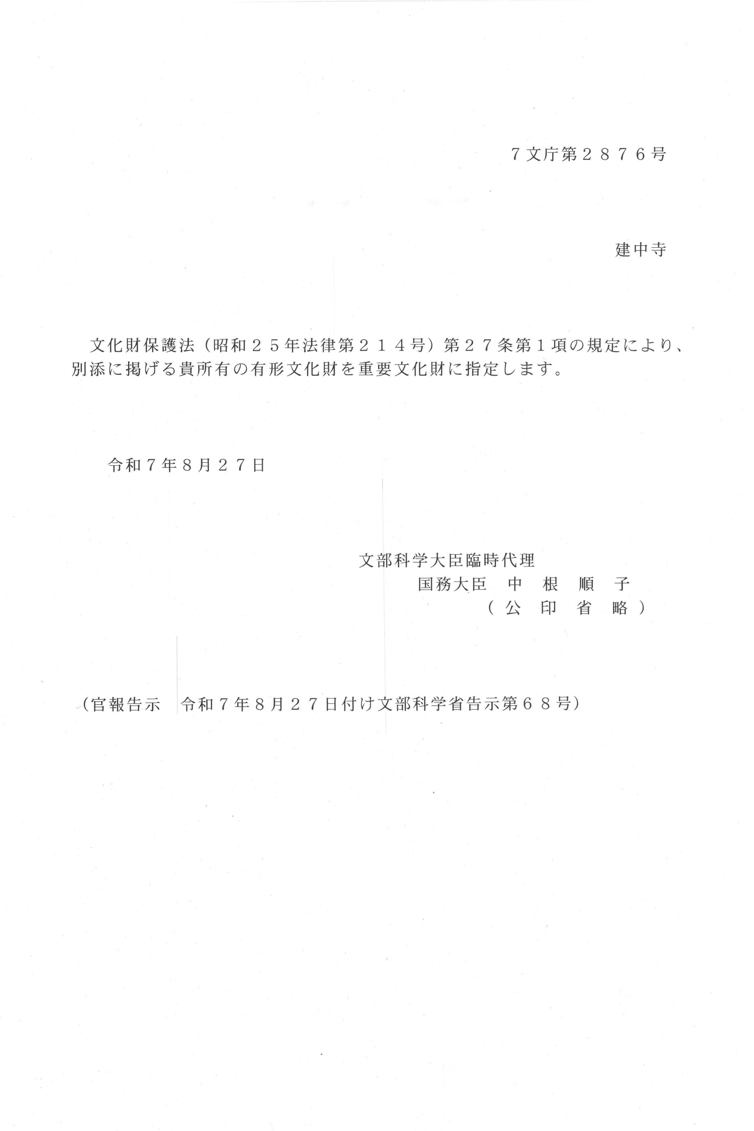 - 令和7年5月16日17時記者発表 建中寺の本堂・徳川家御霊屋が 国の重要文化財に指定されました